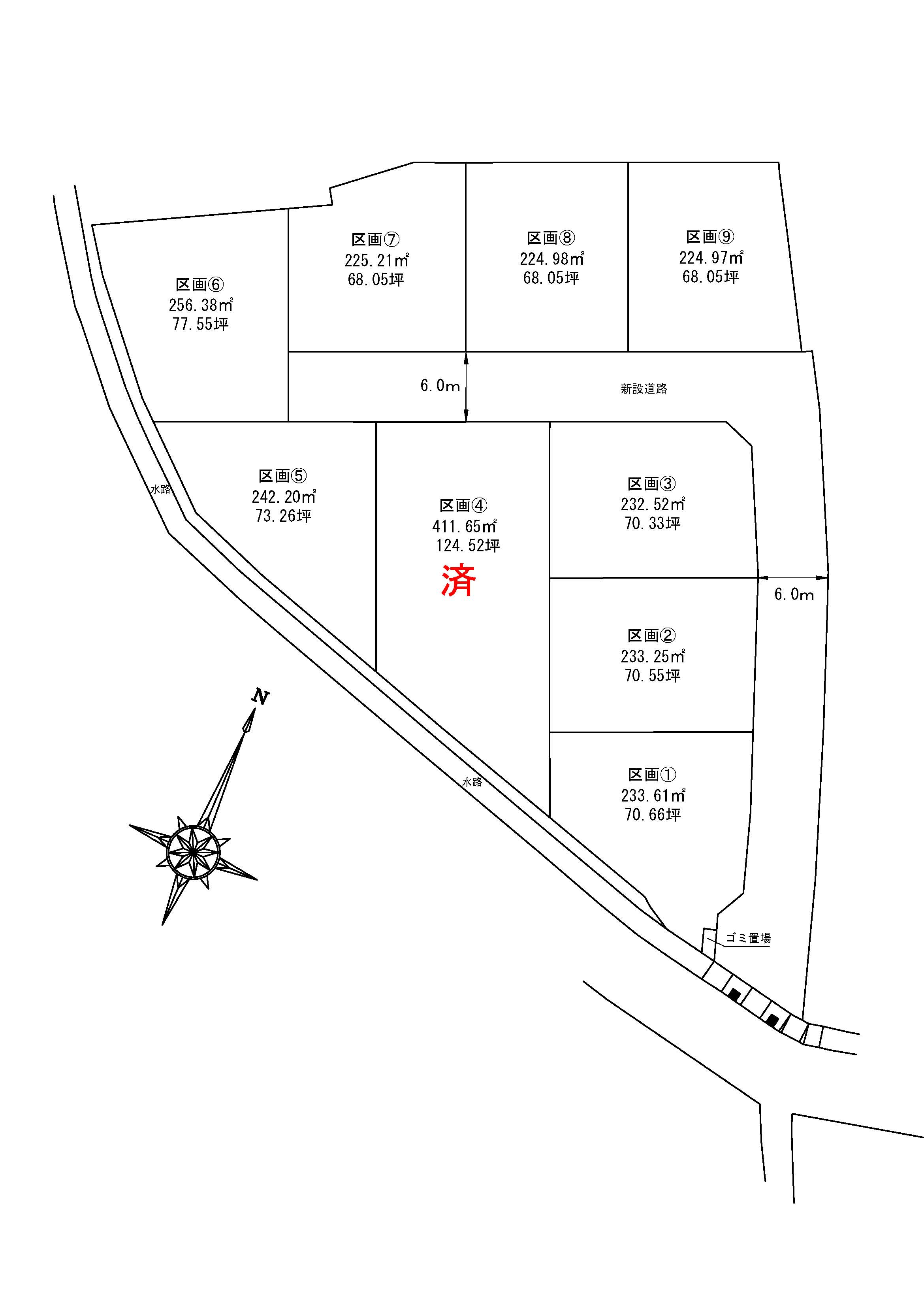 ①233.61㎡(70.66坪)②233.25㎡(70.55坪)③232.52㎡(70.33坪)④済⑤242.20㎡(73.26坪)⑥予約⑦225.21㎡(68.12坪)⑧224.98㎡(68.05坪)⑨224.97㎡(68.05坪) |