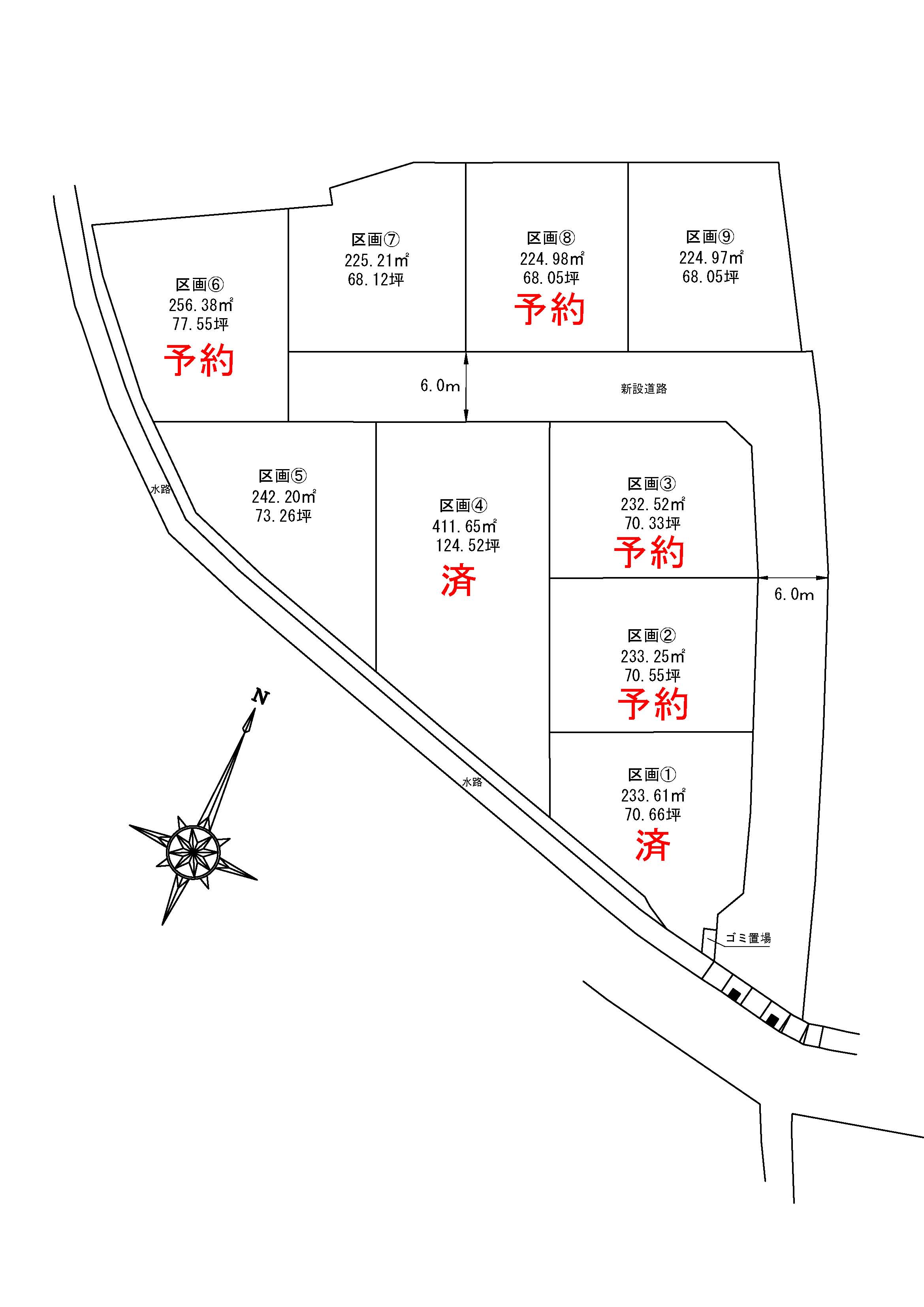 | 土地面積 | ①済②予約③予約④済⑤242.20㎡(73.26坪)⑥予約⑦225.21㎡(68.12坪)⑧商談中⑨224.97㎡(68.05坪) |